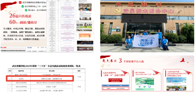 校团委“赓续红色血脉,熔铸精神之源”实践团队入选国家级志愿服务宣讲团;作品入选3个国家级平台展示;录制的8期广播节目覆盖33个村(社区),受众人群超6000人次;共有26篇宣传报道,阅读播放量达60万次,撰写2篇访谈录团队作品在学习强国、中国青年网、湖北日报、湖北高校思政网、三峡晚报、襄州区融媒体、共青团冷水江市委、江夏共青团、乐竞平台等省市、区、县、校级媒体宣传报道。获得学校暑期“三下乡”实践优秀团队一等奖。为湖北省襄阳市襄州区古驿镇拍摄乡村振兴战略实施纪实宣传片两部。
