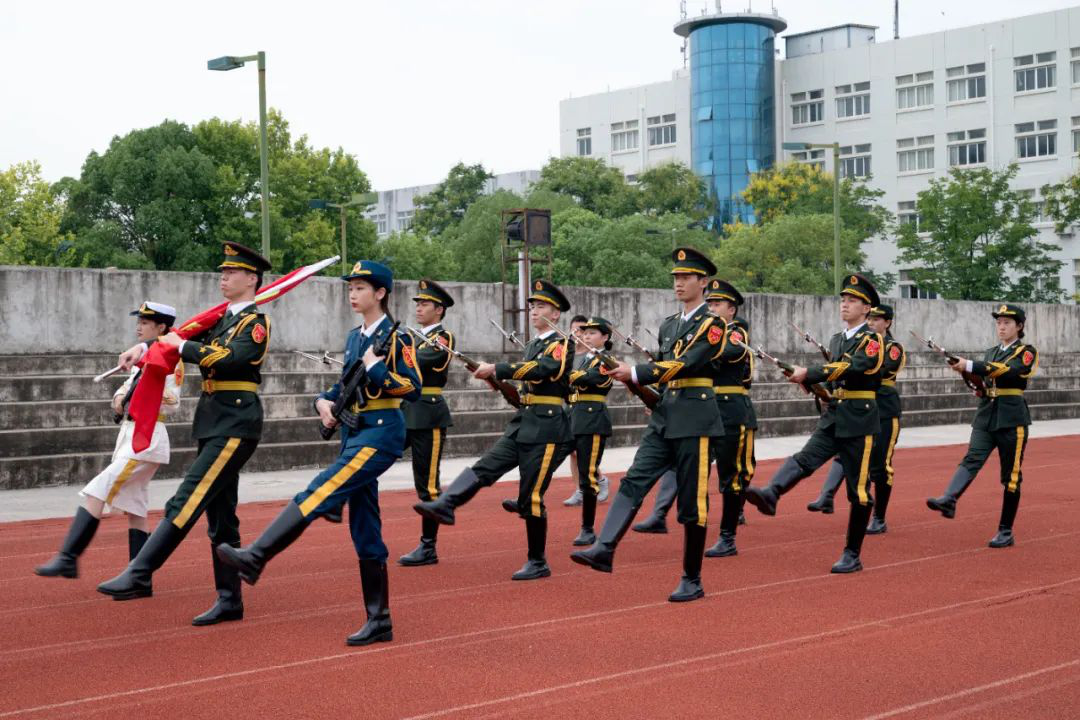 身姿飒爽的国旗护卫队列队向升旗台进发,展现出良好的精神风貌和对新学期的美好向往。伴随着激昂的国歌,鲜艳的五星红旗冉冉升起,全体师生行注目礼,唱中华人民共和国国歌。