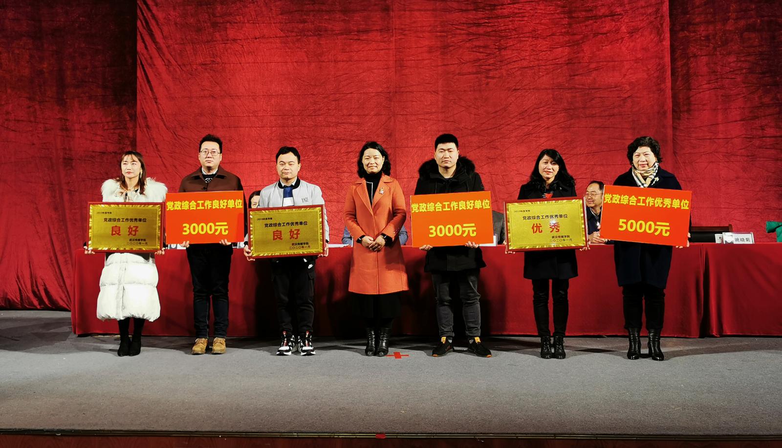 为表彰先进、树立典型,学校决定对2019年度教学、学生、就业、科研、党政综合“五项”工作考核优秀及进步 最大的教学单位和行政职能部门综合业绩奖、创新工作奖及优质服务奖单位予以表彰。副校长王爱民宣读《关于发放2019年度学科竞赛指导教师奖励的通知》和《关于表彰2019年度优秀科研成果的决定》。副校长胡学知宣读《关于表彰2019年度考核“优秀”、“良好”教职工的决定》和《关于表彰2019年度教学单位、行政职能部门考核优良及进步单位的决定》。