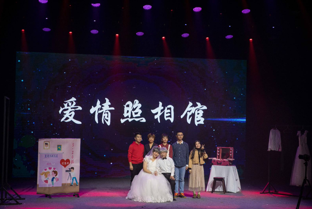 话剧《爱情三部曲》由《致青春》《小丈夫》《金婚》三段爱情故事组成,分别讲述了青涩、平淡和相濡以沫三个爱情片段。该话剧由李哲、范懿、夏露、胡桐、梁爽、王龙、董末末七位老师出演,三对青年、中年、老年恋人从争吵到和好,笑点与泪点并存,获得现场观众掌声不断。“这部剧由于人数多,不容易配合,但学生导演高诗雅很有耐心,帮助我们协调肢体动作、舞台站位,这让大家很有动力。”李哲说道。