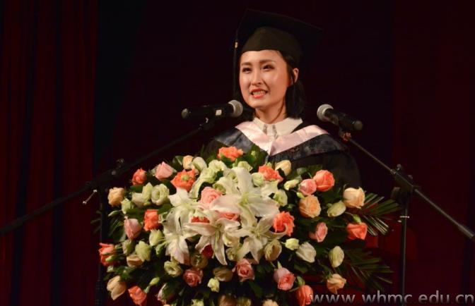 2014级电影与电视学院演艺主持专业周恬如作为学生代表上台发言。从初到学校的懵懂到国家奖学金获得者,周恬如分享了在“武传”的这四年,见证了由“华传”到“武传”的成长。新年朗诵会上声音的魅力,聚光灯舞台上榜样的力量,秋•造艺术节上可爱的老师……都将变成挥之不去的记忆,也使她学会爱与责任,并且有能力传递给更多的人。临行之际,周恬如感谢了从东北赶过来参加毕业典礼的父母,谆谆教诲她的辅导员和老师们,以及贯穿了她四年大学生活的凤凰之声广播台,让她更有信心和勇气走向未来的路,她也祝愿母校越来越好。