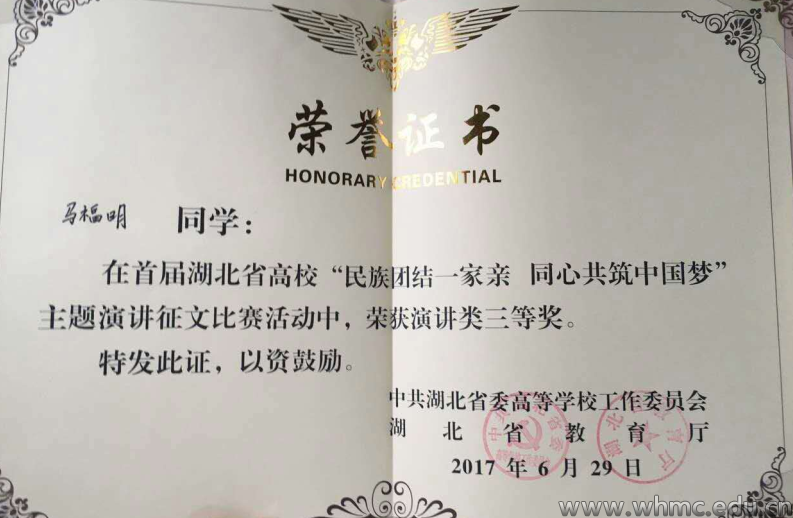 武传新闻网讯 6月29日,由中共湖北省委高等学校工作委员会、湖北省教育厅主办,湖北工业大学承办的首届“民族团结一家亲 同心共筑中国梦”主题演讲征文比赛落下帷幕,播音主持艺术学院2015级学子马福明荣获演讲类三等奖。