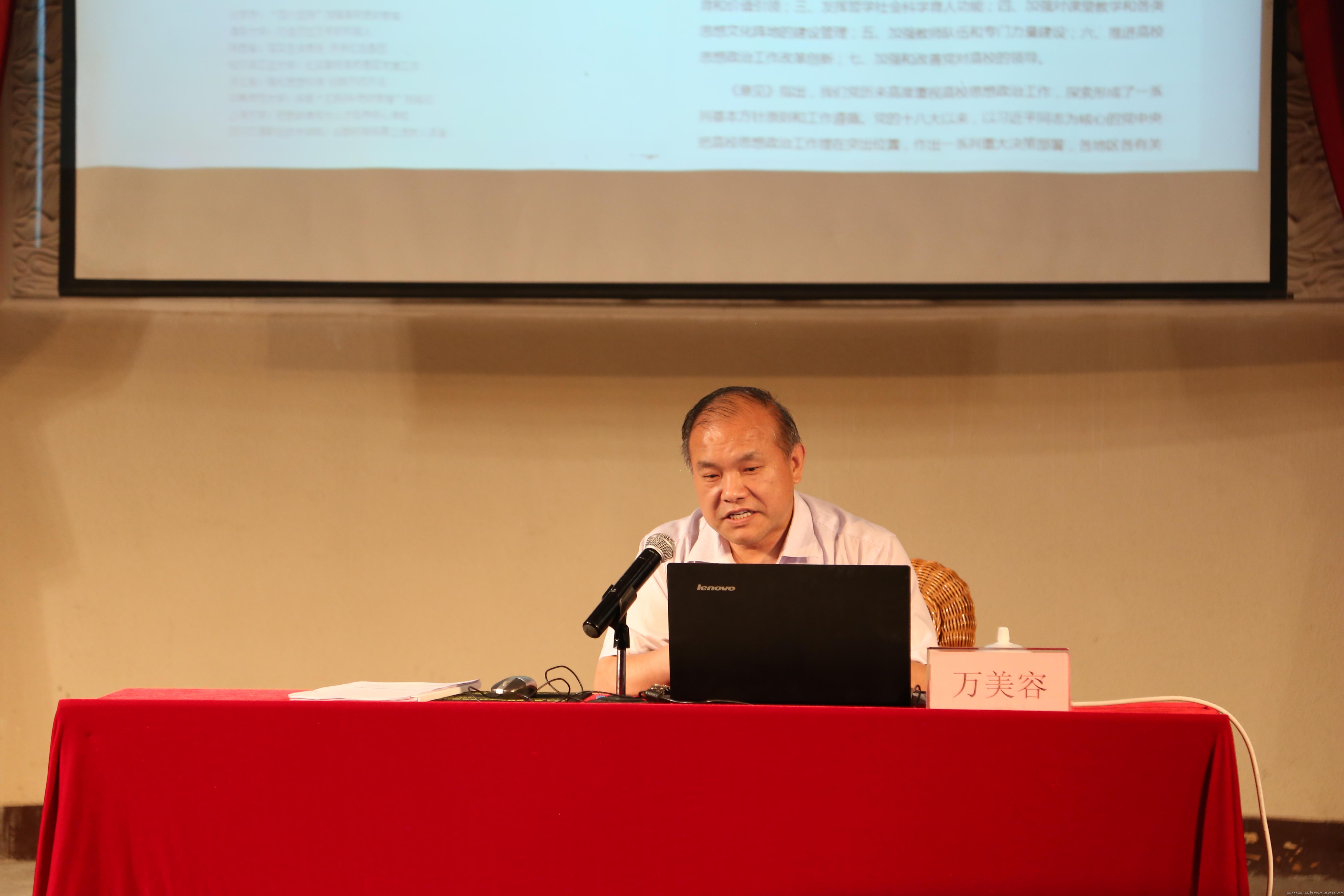 万美容教授以中共中央国务院印发的《关于加强和改进新形势下高校思想政治工作的意见》为出发点,从“中央有关高校思想政治工作有哪些新要求”“为什么要对高校思想政治工作提出新要求”“如何推进高校立德树人工作创新发展”等三个方面论述了加强和改进高校思想政治工作的重要性、紧迫性。