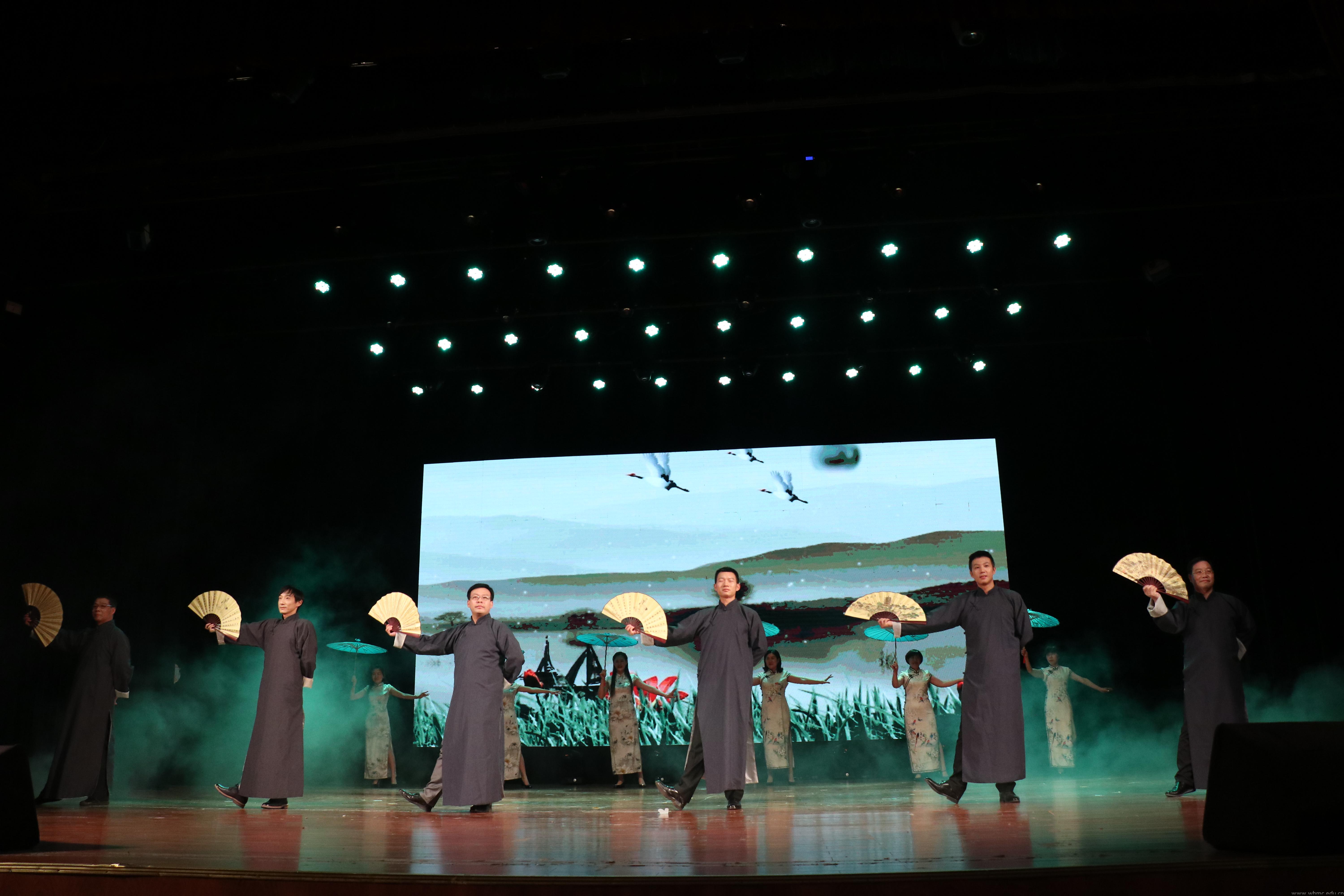 两位相声演员身穿马褂首先亮相,表演时不停地抖包袱、卖机灵。播音主持艺术学院老师表演的相声《东南西北中》逗得现场观众们捧腹大笑。节目融入东北的二人转、西北的民歌、江南的旗袍秀以及中部地区的舞蹈《渔歌唱晚》,将现场气氛推向高潮。继续教育学院带来的舞蹈《牛奶歌》,演员们身穿卡通奶牛装,扭腰、甩手、比牛角,卖萌撒娇,活泼可爱。