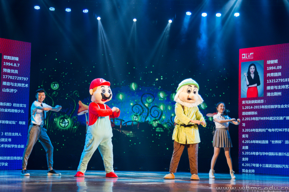 来自播音与主持艺术专业14位毕业生的情景剧《未来星网络直播电视台》,通过“天气预报”、“少儿频道”、“购物频道”、“我是大明星”的节目切换,多方面展现自己的专业能力。其中“少儿频道”的两位主持人澍瞳和曾妮上场,一声欢快的“同学们上课了”让很多同学回忆起小学时代,笑声掌声一片。