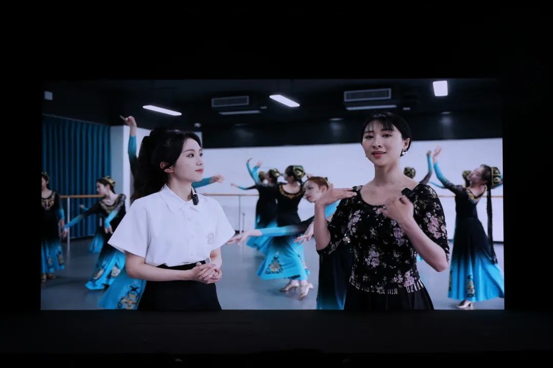 在现场观影环节中,来自我校的三名无人机飞手、五名课堂连线记者以及现场的导播老师先后为现场嘉宾介绍了我校两个校区的场所分布、特色课程教学内容和作品展示。其中,人文与艺术学院舞蹈专业教师李康宁在《中国民族民间舞3》的课堂上,与学生们一同为现场观众展示了舞姿优美、动作流畅的新疆舞表演。短短半个小时别具一格的教学成果展示,得到了在场嘉宾们的一致好评。