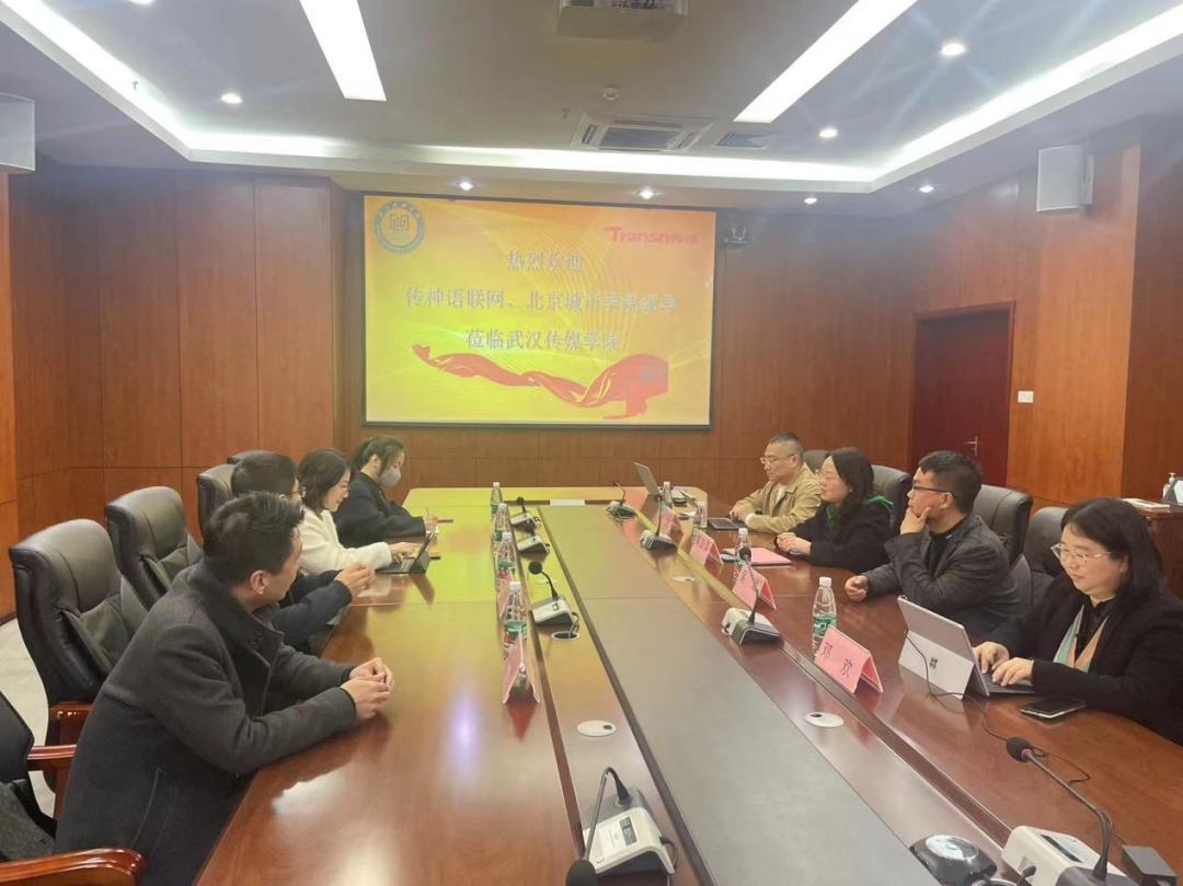 (武传新闻网讯 通讯员 黄娴)为共同探索人工智能时代下英语专业的未来发展之路,3月11日,我校在行政楼206会议室举行了英语专业跨校交流会。应武汉传神语联网网络科技股份有限公司高校部总经理张华和产学合作经理靳伟的引荐,北京城市学院国际文化与传播学部主任李嘉懿和副主任吕英莉,来到我校进行专业调研。我校人文与艺术学院党总支部书记吴斌、教学副院长陶立军、专业英语教研室主任洪俊及骨干教师代表邓欢老师参与本次交流会。