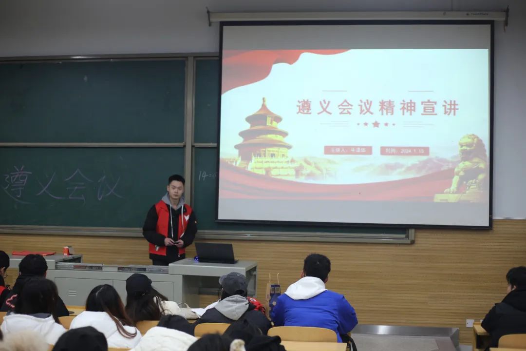 会议现场,以长征精神有关视频开场,在同学们的阵阵惊叹声中,历史上不平凡的一天开始了。1935年1月初,各个渡口堆满红军,正准备长征,然因道路被阻挡,只能开辟新路径,在战火纷飞中,人民群众团结一心用竹子捆扎出一条“生命通道”。 寒冬腊月,波涛滚滚,战士们不畏艰险冒着敌人的炮火,跨越乌江天险,挺进、攻占遵义,得以短暂与休息,于1月15日到17日召开政治局扩大会议史称遵义会议。