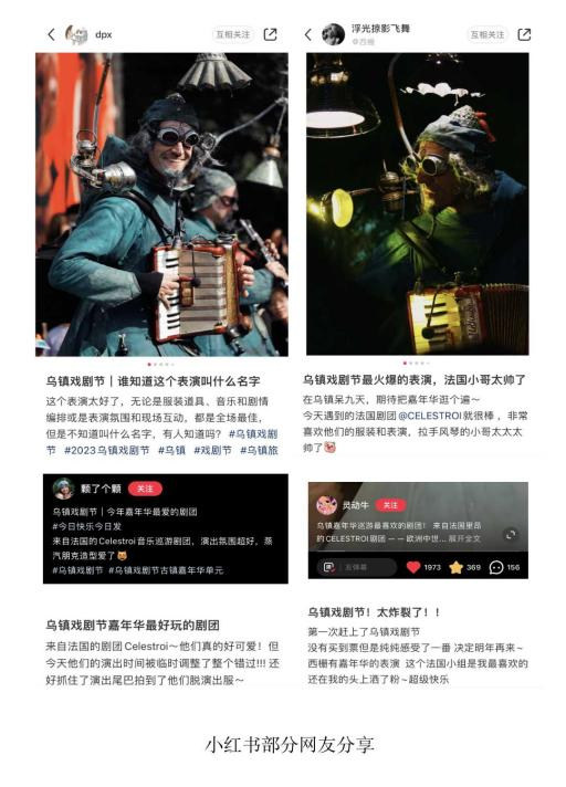 贾庆元老师因为戏剧与乌镇结缘已经九年,第一次参加乌镇戏剧节嘉年华国际演艺策划工作是在2014年第二届乌镇戏剧节。2023年,由他代理的法国里昂Celestroï剧团入选十周年嘉年华板块,收获了观众的喜爱和官方的认可,演出照片多次被官方选作戏剧节推文和视频的封面,被观众评为“第十届乌镇戏剧节嘉年华最有趣的演出之一”,一度在小红书被刷屏,出现在观众整理的嘉年华剧目推荐榜的前三位。