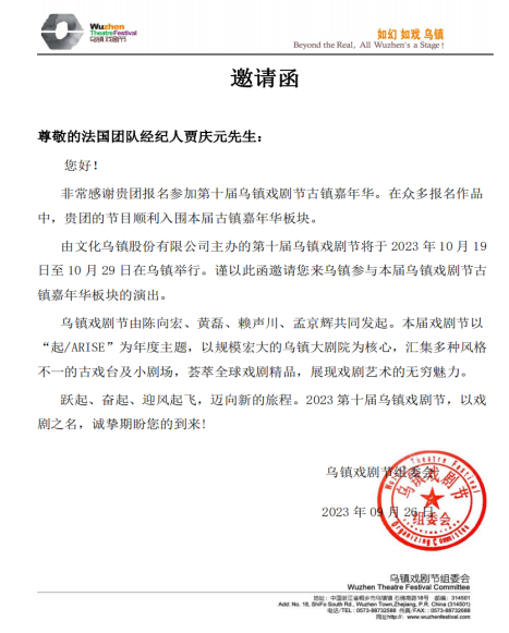 武传新闻网讯(通讯员 蒋冬青)2023第十届乌镇国际戏剧节于10月19日至29日在乌镇举行。其中,我校文化管理学院专任教师贾庆元作为法国Celestroï 剧团中国地区经纪人,带团参加了此次古镇嘉年华单元。