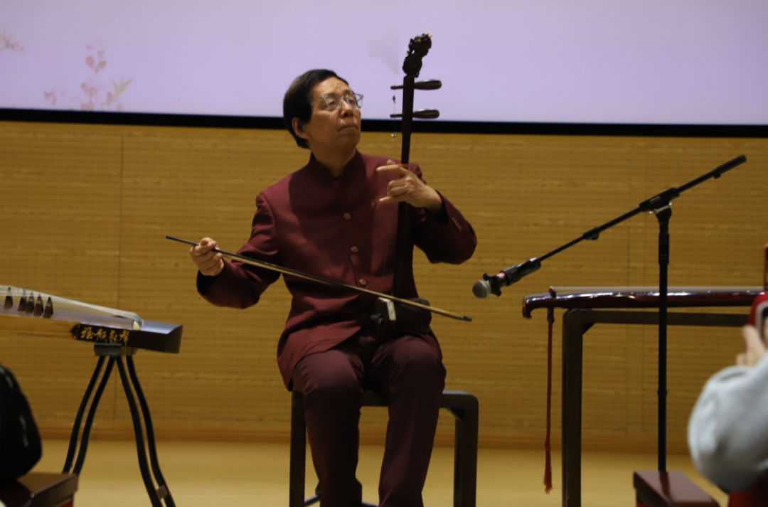 音乐会现场,还有古琴独奏的《高山流水》《酒狂》,萧独奏的《梧桐月》《皂罗袍》,古筝独奏的《渔舟唱晚》《傍妆台》等作品也深得现场观众的喜爱。其中,来自二胡演奏家叶建彬老师的乐曲《赛马》也在其中备受关注。其由远及近、清脆而富有弹性的跳弓,强弱分明的颤音等技巧运用,既展现了一幅生动而热烈的赛马场面,又以乐曲磅礴的气势、热烈的气息、奔放的旋律为此次音乐会画上圆满的句号。