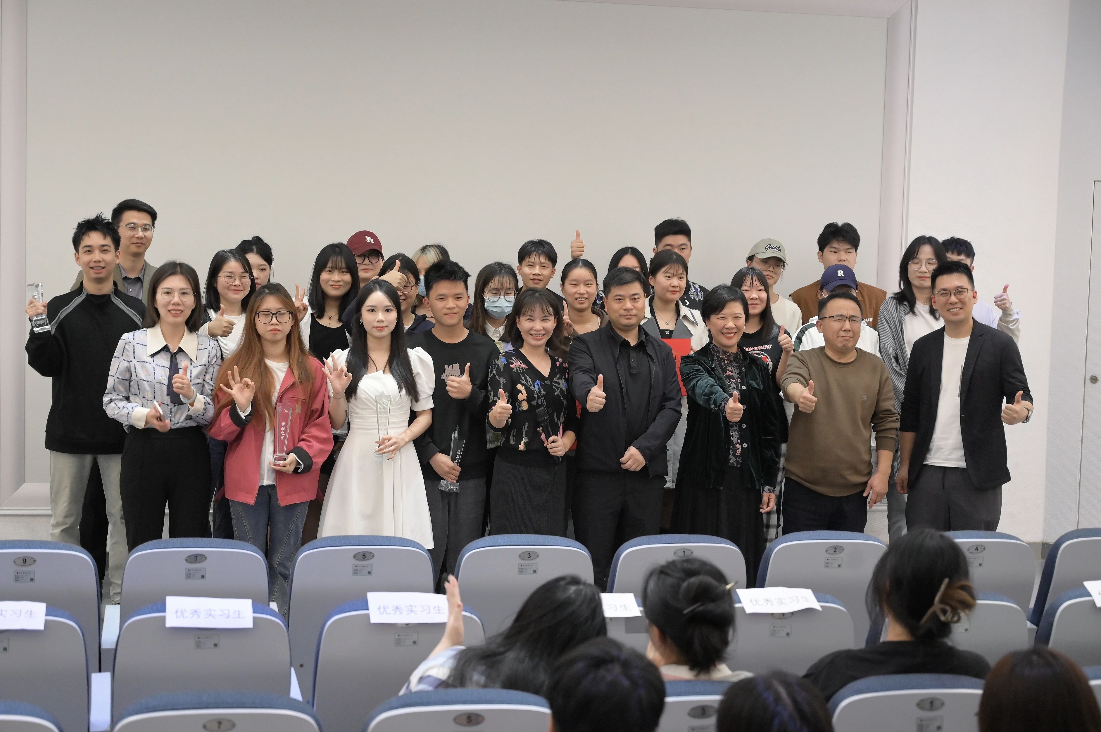 两位嘉宾的分享完毕后,现场掌声源源不断。在掌声和颁奖音乐声中,新闻传播学院四位系主任和两位嘉宾为上一届的20位优秀实习生颁发了证书和奖杯,并与全体获奖同学和指导老师们进行合影留念。