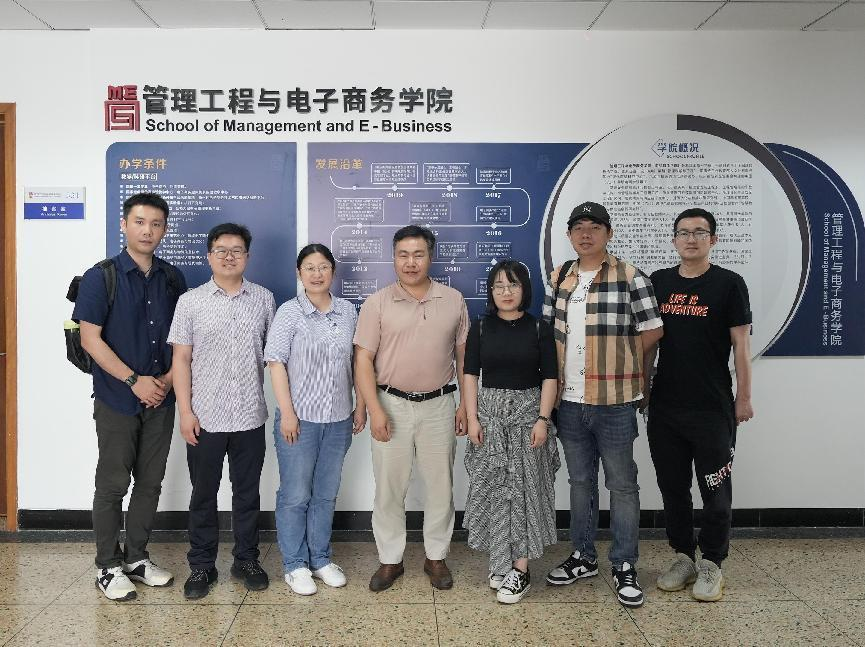 在浙江工商大学,调研组与浙江工商大学的管理工程和电子商务学院副院长季敏教授、电子商务系主任蒋长兵教授、鲍福光教授进行了深入交流。教授季敏首先介绍了该学院电子商务专业的发展历程和学科建设情况,蒋长兵教授详细介绍了他们在人才培养方案和教学改革方面的做法,老师们共同探讨了电子商务领域的创新创业,发展前景。