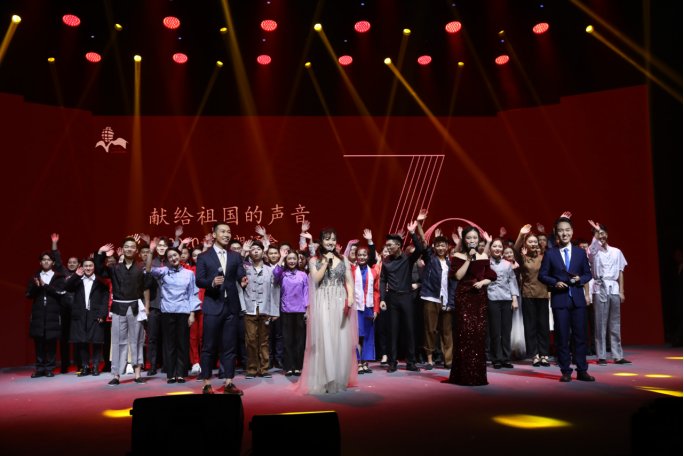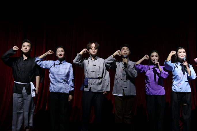 新中国已走过70年的光辉历程,正因为有着祖国亿万同胞的共同奋斗,才谱写了一幕幕可歌可泣的诗篇。下午场朗诵会由乐竞平台播音主持艺术学院学生拉开序幕。朗诵者以诗献礼,声抒长情。当灯光亮起,学生们穿着整齐的白衬衫,呈“M”形状错落有致地站在灯光闪耀的舞台上,个个精神抖擞、气宇轩昂。随后,一位身着红色大褂,颇有“巾帼不让须眉”气势的女生击起了鼓,气势磅礴的阵阵鼓声与朗诵者们铿锵有力的“有朋自远方来,不亦乐乎?”的朗诵将此节目推向高潮,赢得热烈的掌声。