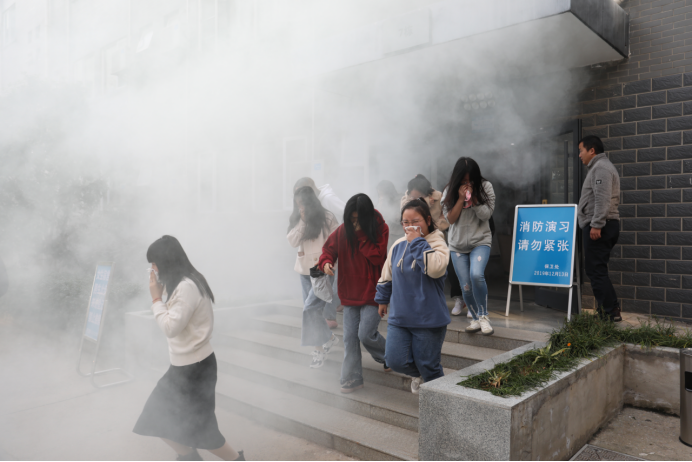 中午12点25分,总指挥收到各部门准备完毕信号后,下达消防逃生演习正式开始的指令。12点30分,烟雾弹分别在西区七栋宿舍三楼、西区七栋宿舍备用楼梯出口、西区七栋宿舍大厅三个地点分别被点燃,烟雾瞬间弥漫整个宿舍楼。记者看到,在烟雾弥漫的同时,学生纷纷下楼进行逃生演习。12点32分,带队老师以及医务人员进入宿舍楼进行疏散和救援还在宿舍中的学生。随后消防队员进入宿舍楼内进行灭火救援。直至12点43分,宿舍恢复正常,同学们回到宿舍楼内,消防逃生演习结束。