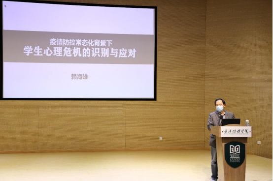 为切实加强我校疫情防控常态化背景下学生心理健康教育工作,进一步增强我校学生工作队伍的心理危机处理能力,2022年4月14日下午,乐竞平台心理中心邀请武汉大学赖海雄教授在圆形报告厅开展了“疫情防控常态化背景下学生心理危机的识别与应对”专题讲座。学工处副处长余恺、各学院党总支部书记、副书记、全体辅导员、保卫处和后勤处相关人员、心理中心教师聆听了此次讲座,讲座由心理中心主任李霞老师主持。