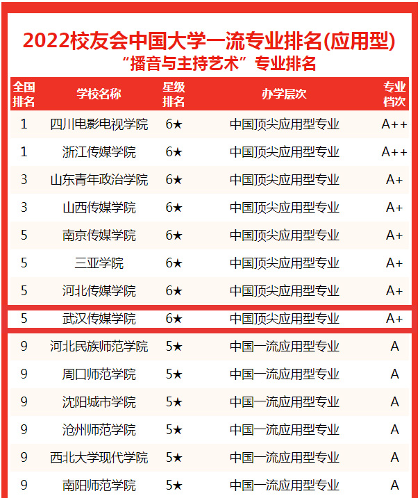 (武传新闻网讯 记者 王艳近日,全国第三方大学评价机构艾瑞深校友会网发布2022中国大学一流专业排名。我校11个专业获赋星,其中六星级(6★)专业1个、五星级(5★)专业4个、四星级(4★)专业6个,排名湖北省应用型大学第20。