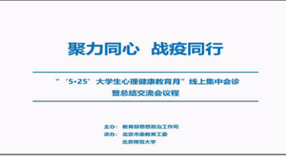 5月25日是全国大学生心理健康日,下午14:30,由教育部思想政治工作司主办,北京市委教育工委、北京师范大学承办的“线上集中会诊暨总结交流会”以网络视频会议形式召开。我校学工处大学生心理健康教育中心全体教师、各学院党总支书记、全体辅导员参加了此次学习交流会。