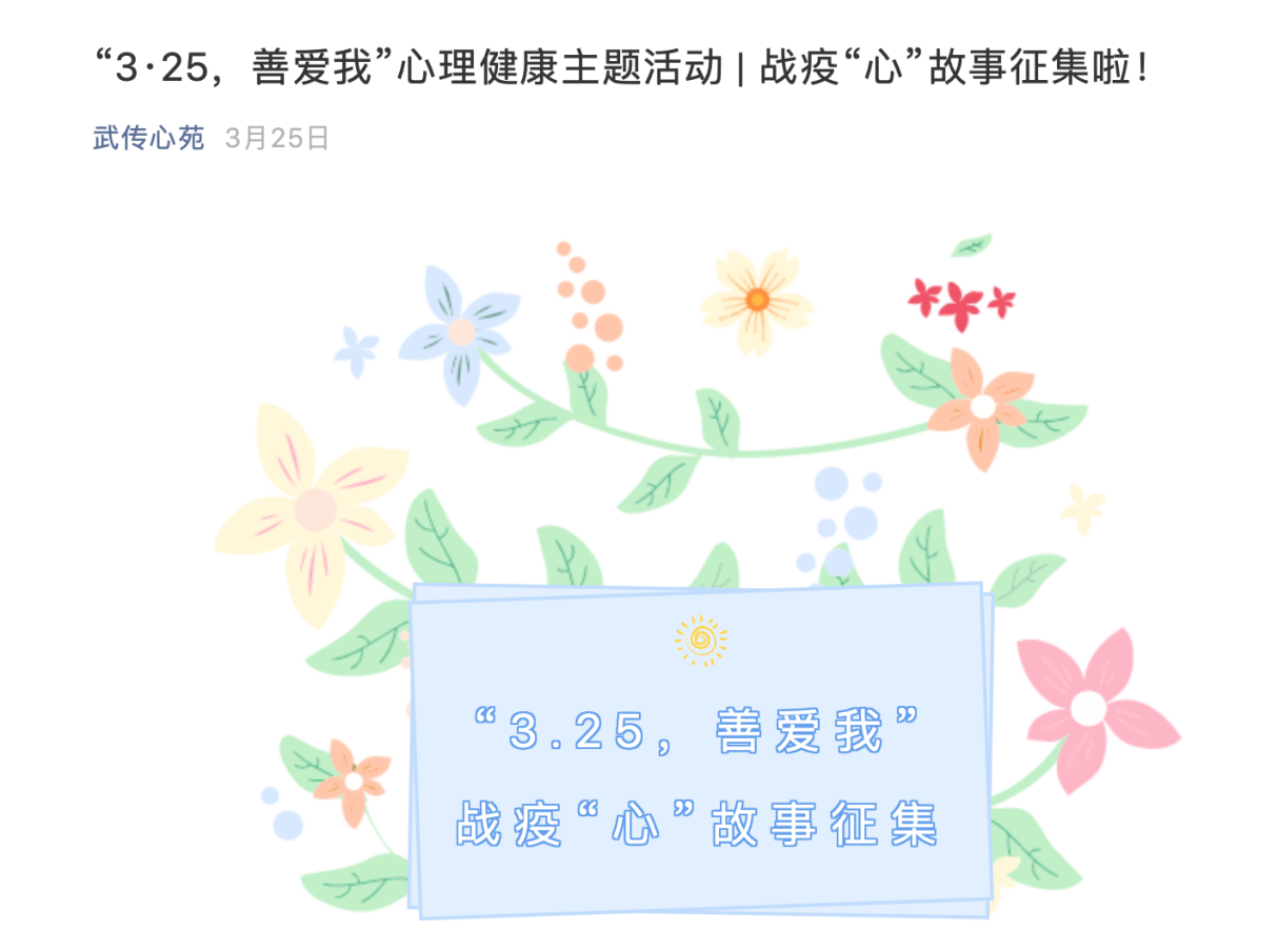 2020年3月25日-4月15日,乐竞平台大学生心理健康教育中心开展“3·25,善爱我”心理健康主题活动——战疫“心”故事征集。本次活动旨在倡导大学生善待自我,关爱自我,怀着一份温暖,包容欣赏和接纳自己,传播抗疫期间的心理正能量。