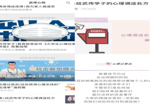 新型冠状病毒不仅侵袭身体,也影响着疫情之下人们的心理。面临病毒和死亡的威胁、交通管制和初期医疗资源的不足、生活的不便、社群生活的丧失,很容易无所适从,各种心理问题频出。针对新型冠状病毒感染的肺炎疫情可能使师生产生的焦虑、恐慌等情绪反应,心理中心通过“武传心苑”微信公众号定期发布科学疫情防护知识、心理调适方法的科普文章,提供全国各地免费心理援助热线以及大学生心理应激系列讲座等相关资源,通过《邮递|给武传学子的心理调适处方》、《助你度过危机|这份获得心理支持的“自助清单”请转绪》、《@武传学子|教育部思政司《大学生心理应激系列讲座》观看指南》等一篇篇推文引导广大师生正确面对疫情,做好自我防范,理性看待和接纳自己在面对疫情时的心理状态。通过《满满亲情战疫情|我为家人做道菜》、《正念小练习:正念茶饮》《睡个好觉吧|疫情期间的你该如何应对失眠?》《停课不停学|疫情下的网课到底该如何应对?》等文章,引导广大学生理性看待疫情,化疫情带来的危机为积极的成长契机,以理性平和、积极向上的心态面对疫情的挑战。