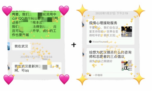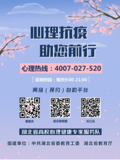 心理中心的三位老师不仅关注本校师生的心理问题,还心系着社会群众。心理中心主任李霞老师带领两位专职心理教师主动请缨,第一批报名加入到湖北省委教育工委、省教育厅组织的心理热线服务当中,面向社会大众开展疫情相关心理服务工作,为广大民众提供心理支持。面对疫情,她们牺牲了个人的休息时间,按时值班,认真对待每一通热线电话。她们通过在线培训学习为自己穿上专业的“心理防护服”,积极参加每周的小组督导,进行研讨案例,不断总结和提升,使心理援助尽可能务实而有效。她们的目标只有一个,就是在这场没有硝烟的战争中,尽自己的一份绵薄之力,来陪伴需要帮助的人们平安度过这段艰难的岁月,直到最后的胜利。