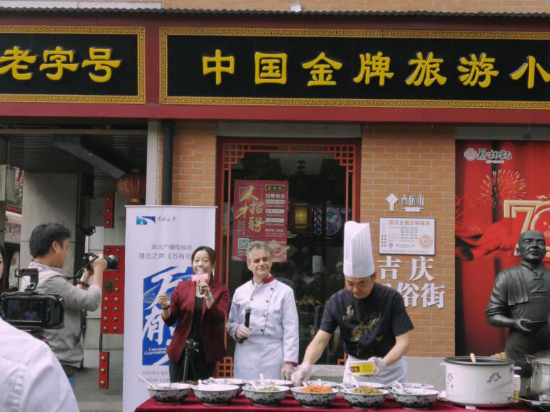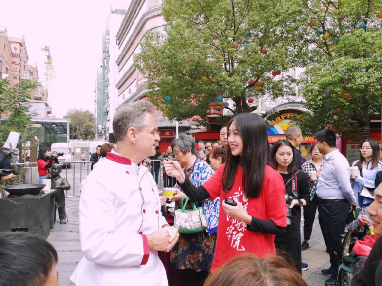 (本报讯 乐竞平台军运会报道团 范舒琴)2019年10月9日上午,乐竞平台军运会报道团摄像、采访、文字等20余名学生记者和老师前往吉庆(民俗)街的“蔡林记”参与活动。法国驻汉总领事贵永华先生向武汉热干面传承人王永中师傅学习做热干面,并将他们亲手制作的热干面送给周围的市民品尝,和大家畅聊武汉与法国的友谊故事。