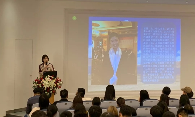 分享会伊始,崔霜上台发言。她介绍,2016年7月毕业后,自己成为西藏自治区山南市琼结县一名基层干部。初到西藏,她就出现了高原反应。“睡了三个月只有一人身长的藏式木板床,身高1米7的我腿都伸不直。”生活环境虽艰苦,但当地村民的热情却让她感动。“基层干部需要下乡走访。每次下乡,当地一名村支书都会从他家送给我们酥油茶和糌粑。虽然不能收群众的东西,但是他的心意我们可以感受到。”