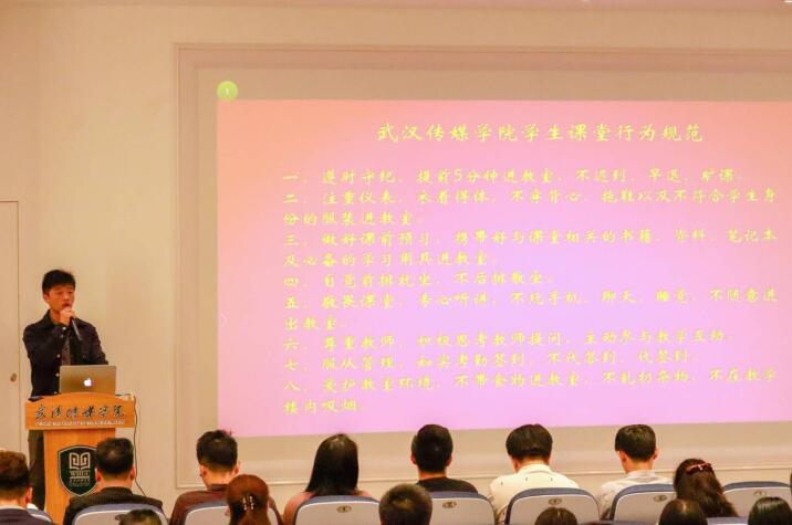 最后,学生工作处处长张燕明致辞。他指出,此次会议对我校校风、学风建设统一思想、提高认识、凝聚人心,深刻领会“四个回归”具有重要的现实意义,并就如何回归常识,刻苦学习,争做新时代优秀大学生提出了三点建议:遵守规则,加强学风建设;脚踏实地,刻苦学习知识;树立理想,争做新时代优秀大学生,为实现中华民族伟大复兴奉献自己的力量。 接着,已考取武汉大学研究生的应届毕业生代表徐奇睿同学发言。她向大家分享了考研路上的心路历程,建议学弟学妹们把握现在的每分每秒,珍惜生活中每一个学习的机会,切勿将时间浪费在没有意义的事情上。电影与电视学院谢厚民同学作为在校生代表也向大家分享了几点体会。教师代表何卓伦老师作了以“强化课堂教学,践行立德树人”为主题的发言。他说到,教师要从重视教学、严格课堂管理、创新教学方法和手段、树立自身终身发展的理念这四个方面着手,强化课堂教学,落实立德树人根本任务。(学工处供稿)