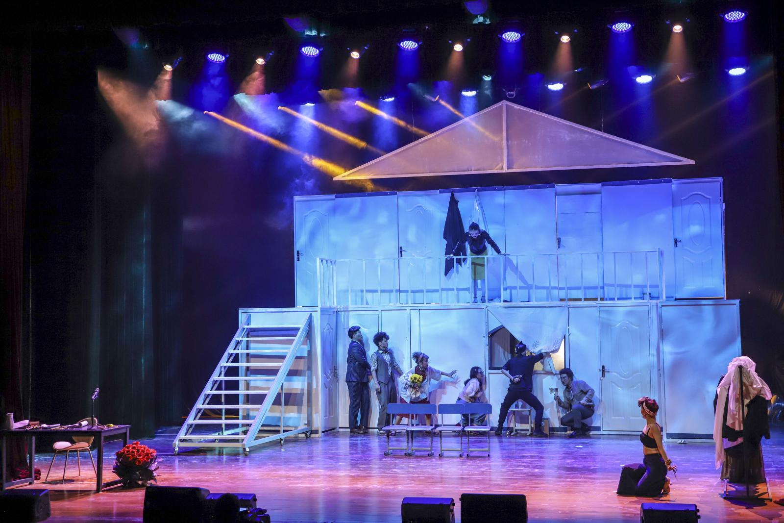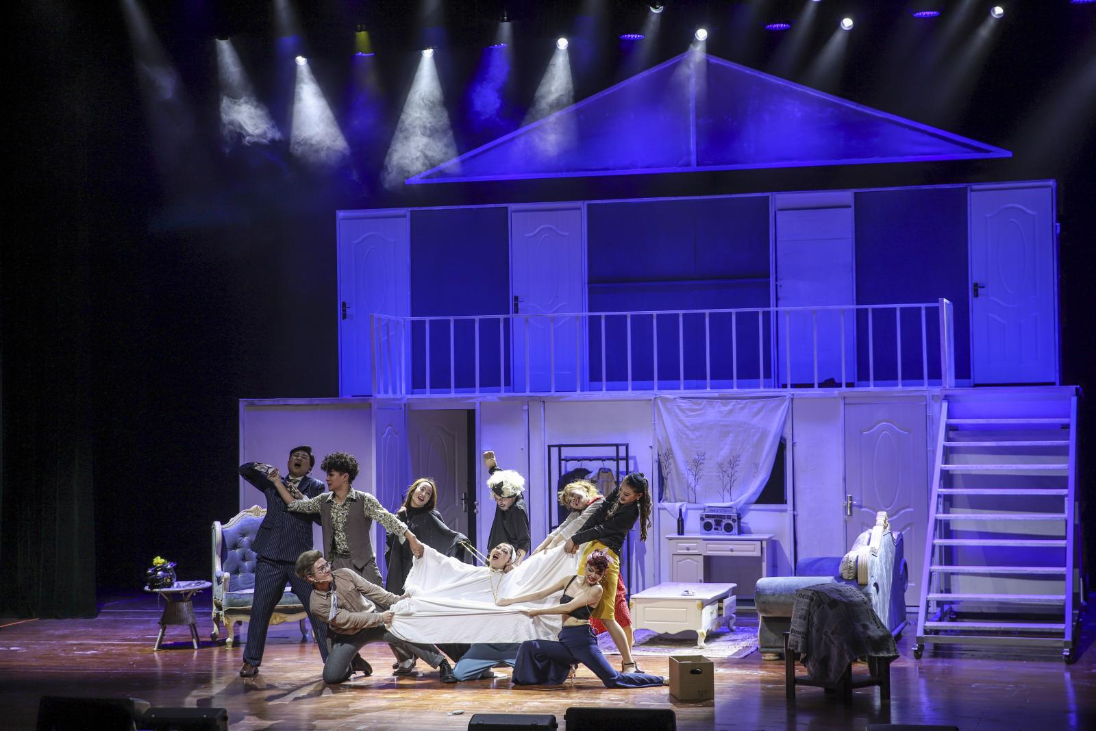 可转换成台前、幕后的背景道具“双层小别墅”也是话剧中的一大亮点。“因为别墅的楼梯、支撑柱需要随着场景的转换来回移动,演员密集地开门关门、楼上楼下满场跑,承重问题面临很大挑战。钢架需要特别加固,必须将出现演出事故的可能性降到最低。”2016级戏剧影视美术设计专业的夏心悦介绍,道具由同专业的老师和同学一起设计,耗时3个月完成。
