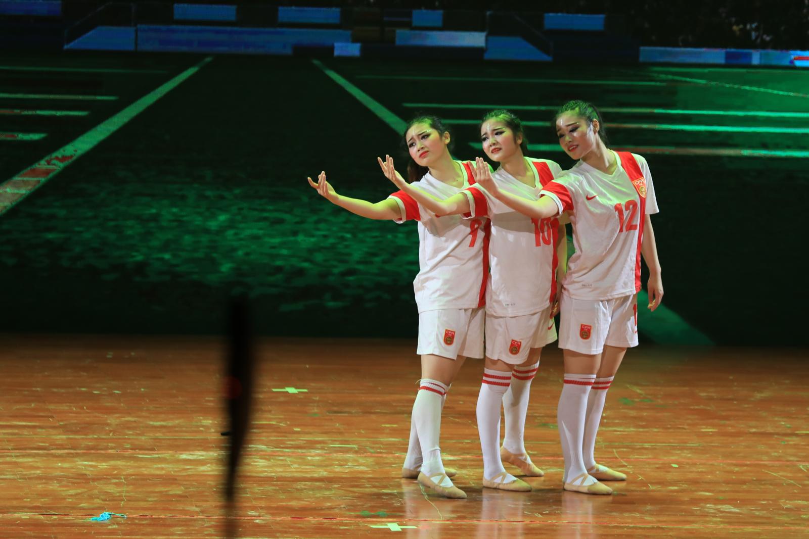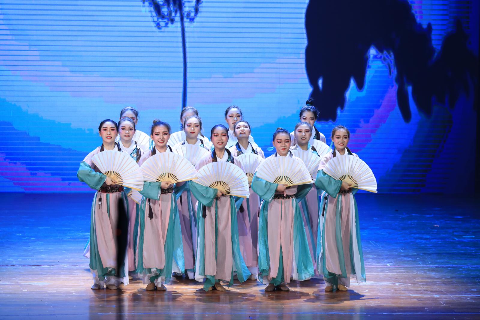 演出伊始,20名舞者身穿蓝色的服装,在蓝白交织的灯光下用一把挥动绸带,摆动长裙翩翩起舞。开场舞《风酥雨忆》将山东海阳和胶州地区的秧歌风格结合在一起,舞出了汉族女子细腻。随后,舞蹈学专业何睿、张琪敏、魏茜3名毕业生身穿足球服表演了现代舞《博了哭了》,用肢体语言讲述了女足运动员在比赛场上顽强奋斗的故事。据了解,舞蹈《搏了哭了》是三人大一时第一次参加比赛的作品。何睿表示,当年为了准备比赛需要节食控制体重,赛后吃大餐庆祝的样子仿佛就在昨天。