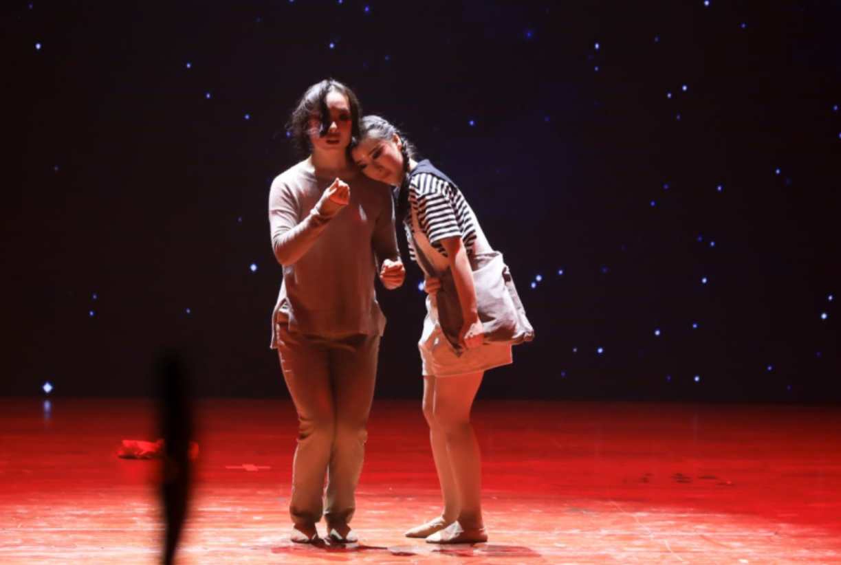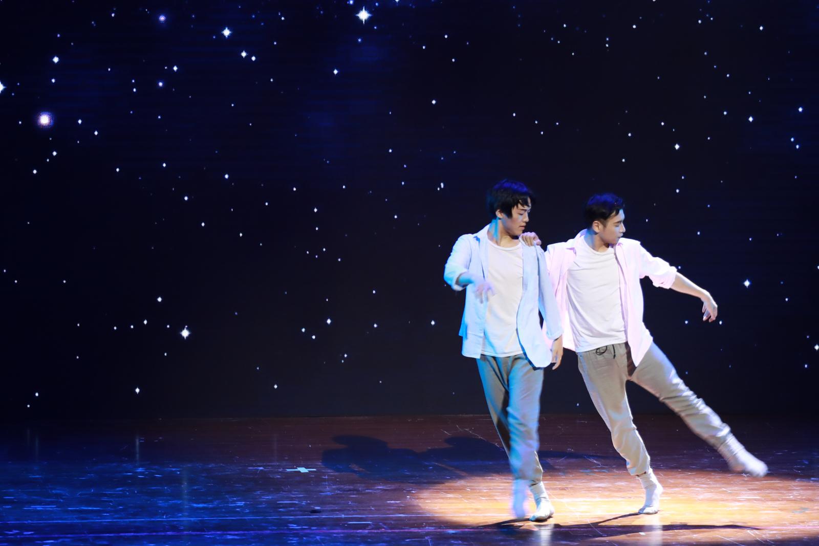 在逐渐变快的心跳声下,舞者紧紧相拥。原创舞蹈《疯人愿》由老师陈义和学生邓敏、邓一帆编排创作,讲述了孩子和精神病母亲之间的故事。邓敏表示,作品灵感来自于身为精神病患者的外公的妹妹。为了更好体会精神病患者的情绪和状态,她查阅了大量资料,曾5次将自己关进“小黑屋”听恐怖音效。邓敏坦言,看见最终作品后哭了很久,半年都沉浸在压抑的情绪里,感觉自己都快病了。