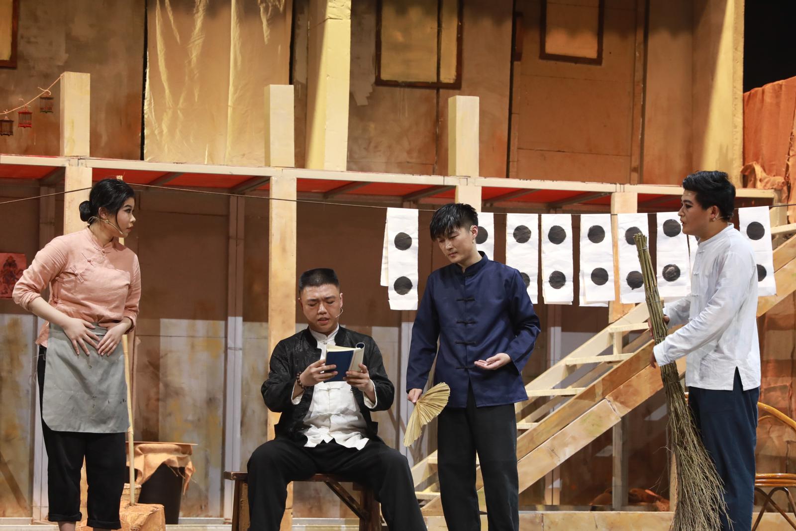 “痨病棵子、一贯道、暗门子、油葫芦、挂零儿……”为了还原北京平民小院的生活,整场话剧由北京话贯穿。在全班没有一个北京人的情况下,学习北京话成了演员们最大的难题。剧中古月宗的扮演者肖南辰介绍,为了学习北京话,他们一句一句的查询台词对应的北京方言,研究了《万家灯火》《茶馆》等老北京话剧的语调。“学习过程中,我意外发现郭德纲的单口相声对学习北京话很有帮助。观看了《济公传》《张小乙下南京》等作品后,被他仅凭一张嘴就能把观众带入剧情的能力吸引,通过摸索和模仿我的台词也得到了进步。”演出过程中,2018级广播电视编导专业学生孔令栋激动的表示,作为地道的北京人,觉得很有代入感,演员们的北京话非常标准,十分亲切,都怀疑他们是否曾在北京生活过。