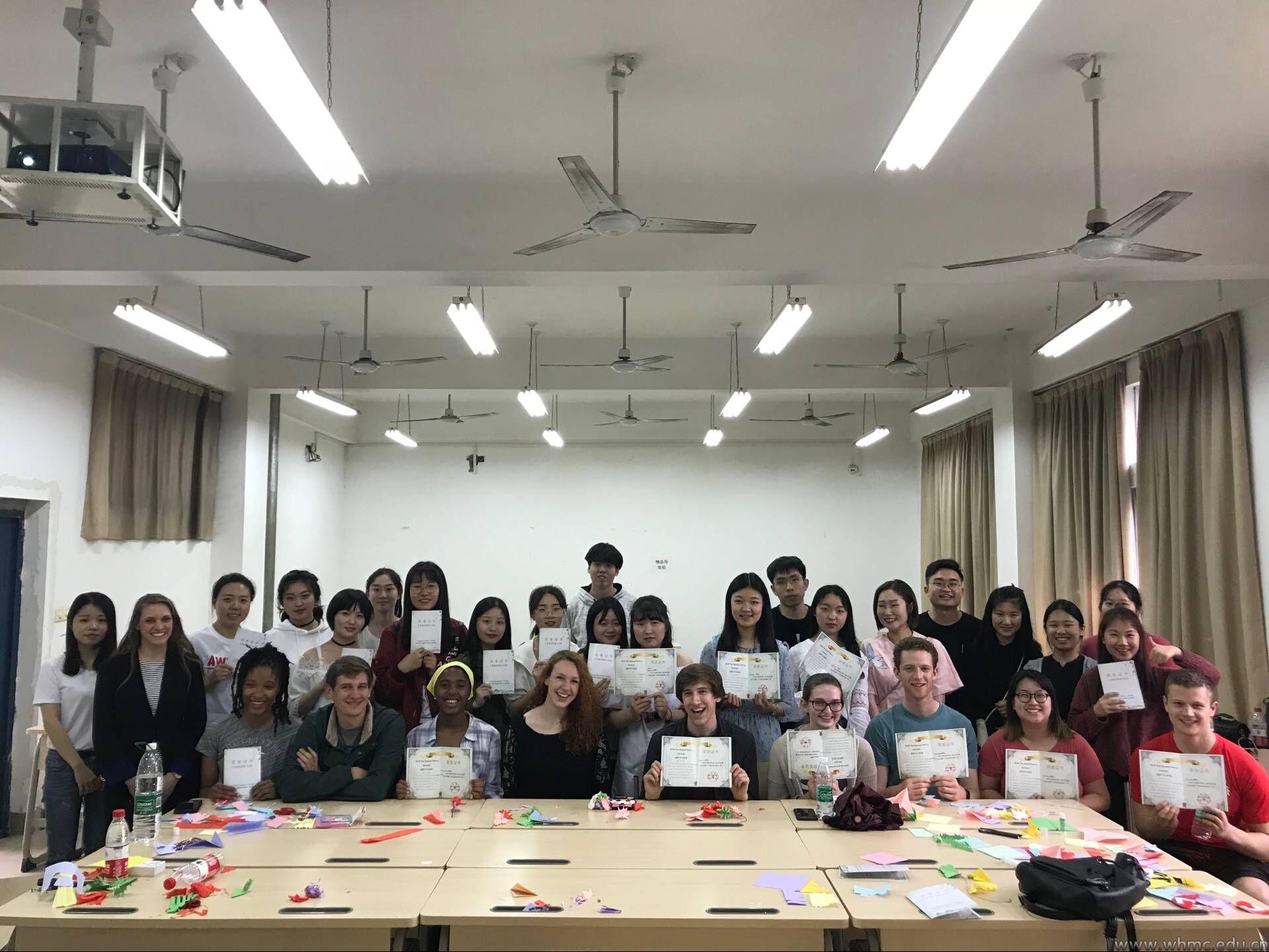 饺子宴过后,交流生参加了当日举办的诗词大赛,交流生与我校学生共同进行了“诗词你说我猜”和“传声筒游戏”环节。交流生们流利的中文发音赢得学生们的一片掌声,也很快与现场学生观众熟络起来。随后的中美友谊赛颁奖典礼上,人文与艺术学院为美国友人了准备了精美礼品并拍照留恋。