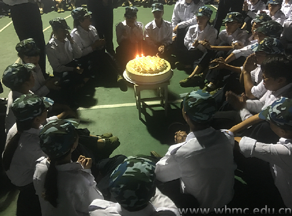 当晚,设计学院新生正在运动场上围成一圈拉歌,辅导员罗晓曼突然上前念了21名新生的名字,正当同学们摸不着头脑时,一个精心准备的大蛋糕被搬到了学生中间,同时人群中传来了“祝你生日快乐、祝你生日快乐……”的歌声。伴随着生日歌,21位寿星被请进人群中央,围着蛋糕许下了生日愿望。