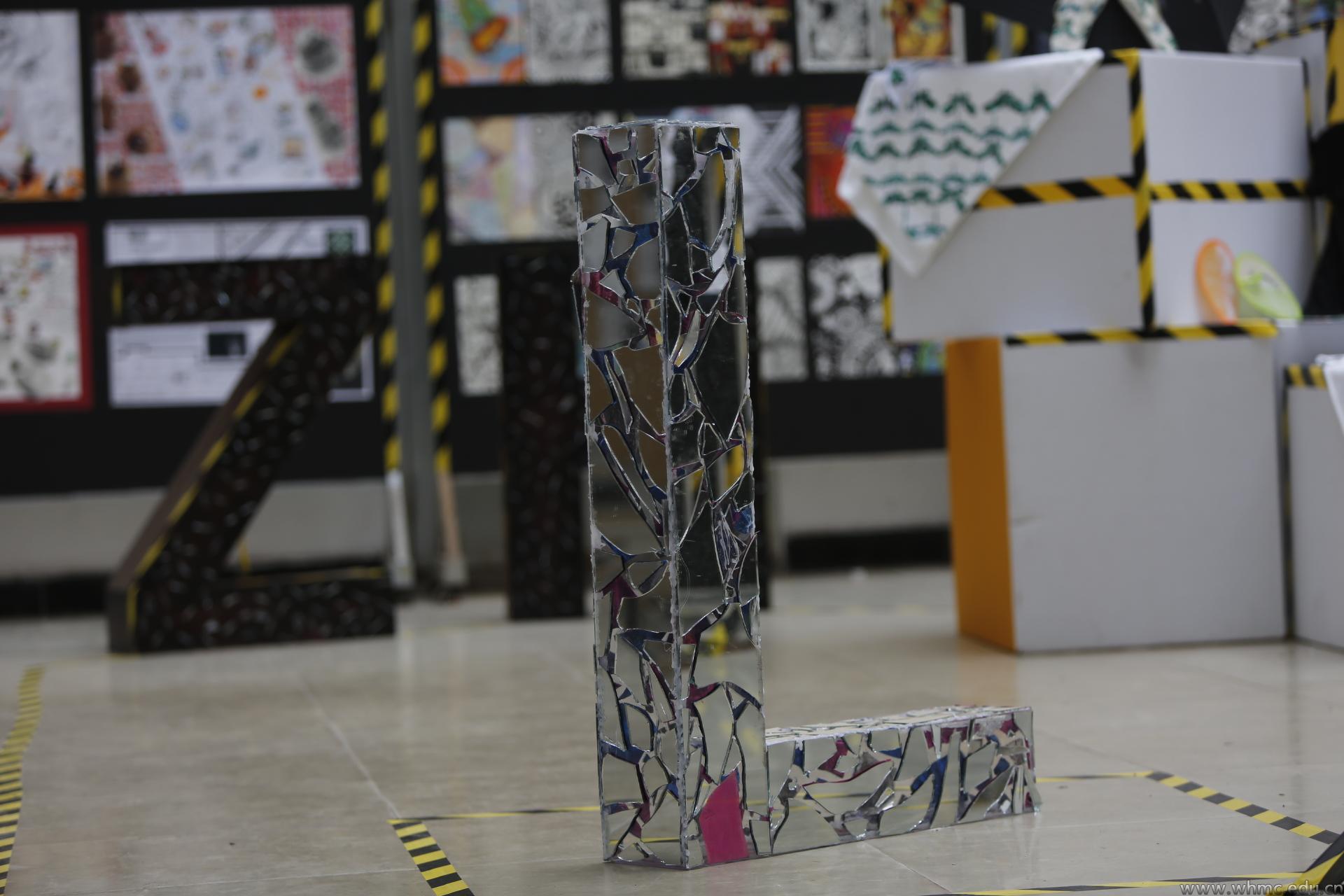 展览大厅是视觉传达设计专业同学的123件作品。展厅中间是一款“L”形玻璃模型,模型外侧粘贴不规则的镜子碎片,内侧根据外侧玻璃的形状剪成相应大小的彩色亮片,再用玻璃胶将10片玻璃拼成了一个中空的“L”,当灯打开的时候就会有色彩斑斓的效果;左侧是以“儿时”、“消逝”、“秩序”、“温暖”为主题的手绘图文;右侧是120副线条、圆圈构成的色彩图。