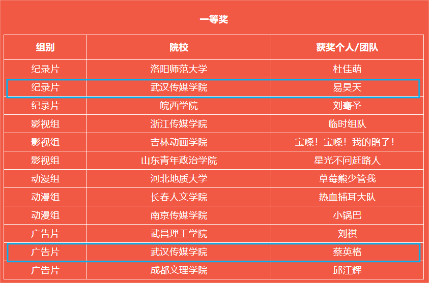 此次决赛,我校播音主持艺术学院共入围4部配音作品,首次实现了动漫、影视剧、广告、纪录片4类各一部入围作品的“大满贯”。其中,广告组的蔡英格和纪录片组的易昊天荣获全国一等奖,由顾庭瑞、谌普、张永康、张园申组成的小组“从容应队”和由牛加正、王昊东、许航琼组成的小组“牛气冲天”分别荣获影视组和动漫组的全国三等奖。获奖学生由播音主持艺术学院教师程骥、张新、易昊天、李娟和辛逸乐进行指导。