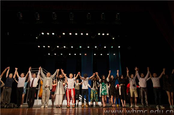 据了解,整场话剧不同风格的歌舞共有8种,牛仔、吉他手、红裙舞女轮番上场,演员们蹦蹦跳跳,让欢乐填满了整个大厅。导演于昊介绍,歌舞戏相结合,让话剧形式更为丰富,能全面展示学生的能力,也让学生们明白,形体对于一个演员的重要性。