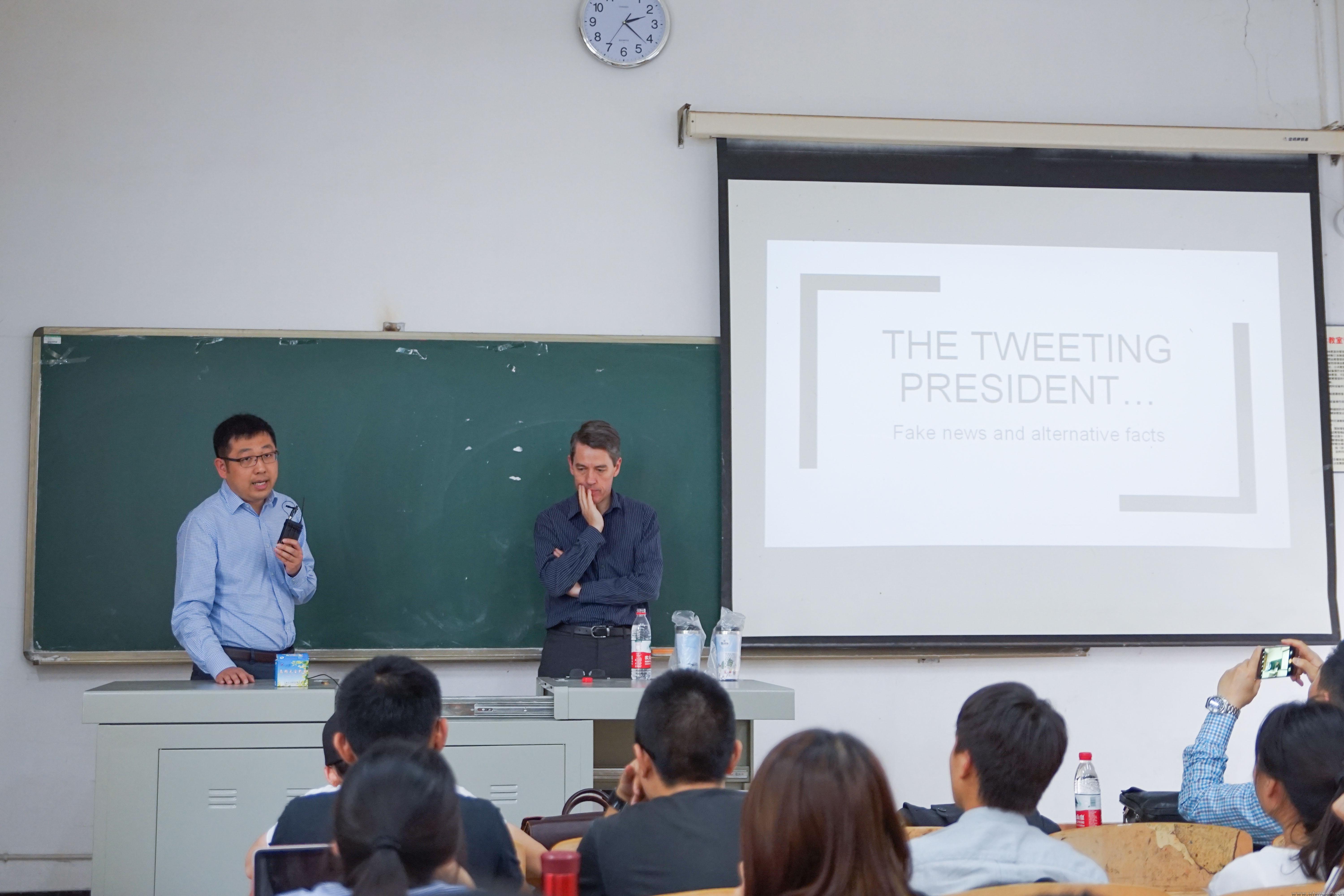 武传新闻网讯(文/见习记者 曹浩 图/摄影见习记者 李洁莉)5月25日下午2时,澳大利亚迪肯大学传播与创意艺术学院院长马修·艾伦教授(Matthew Allen)受邀来我校讲课。在3104教室里,马修·艾伦教授以“虚假新闻与另类事实——‘推特总统’特朗普”为题,在讲述自己学术观点的同时与在场师生就“社交媒体的发展”和“传统新闻性质受到挑战”等问题展开讨论。