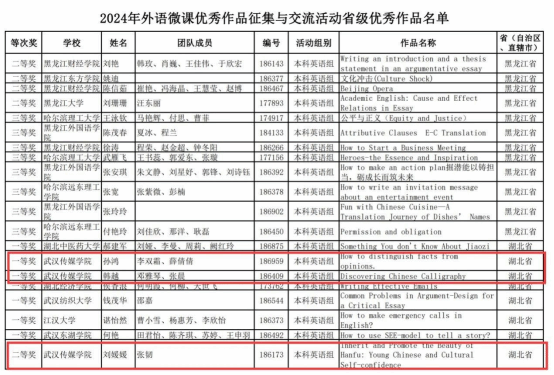 本次大赛中,湖北省共评出7个一等奖团队,我校独占两席,成为全省瞩目的焦点。其中,孙鸿、李双霜、薛倩倩团队与韩越、邓雅琴、张晨团队凭借新颖独特的教学内容、生动活泼的教学形式以及深厚的语言功底,共同摘得一等奖桂冠,并获得参加全国交流活动的宝贵资格。