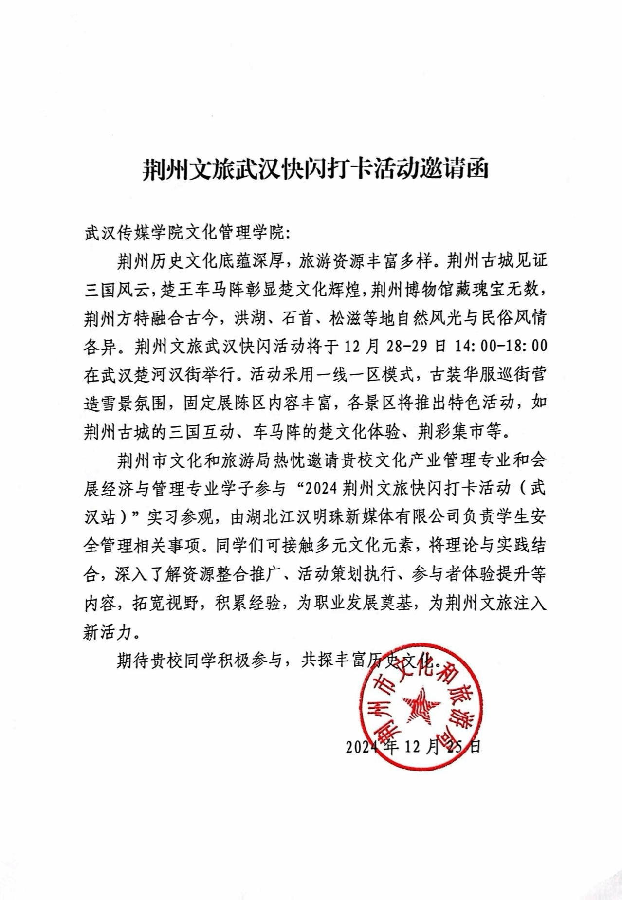 (通讯员 张弘)近日,我校文化管理学院受邀参加了由荆州市文化和旅游局主办的“知音湖北 遇见荆州”2024荆州文旅快闪打卡活动。本次活动于12月28日至29日在武汉楚河汉街屈原广场展开,旨在通过创意快闪的形式,将荆州丰富的历史文化与现代旅游元素紧密结合,向广大市民及游客展示荆州独特的文旅魅力。乐竞平台文化管理学院派遣了一支由师生组成的代表团,积极参与其中,共同见证了荆州文化的璀璨绽放。