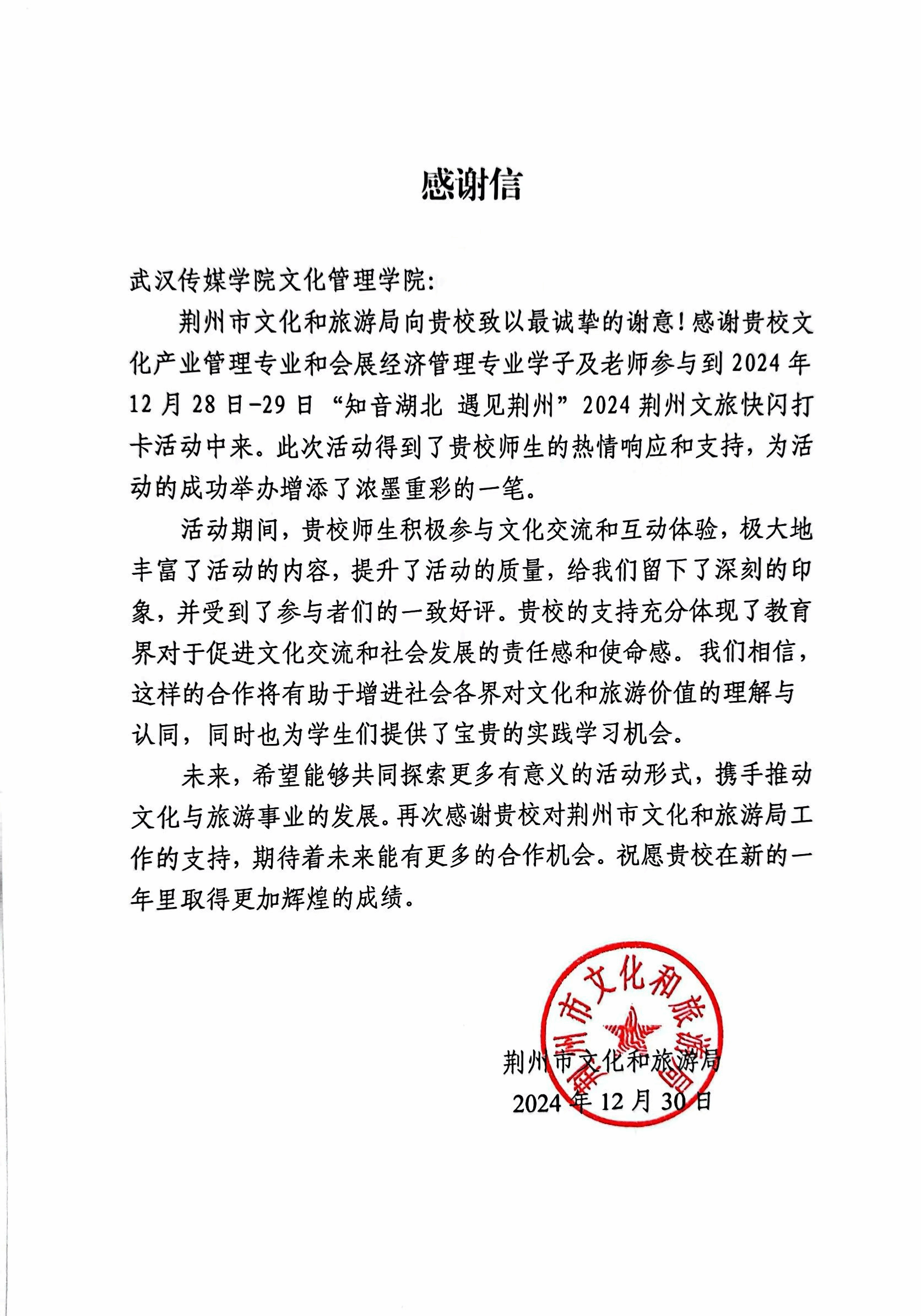 活动结束后,荆州文旅局特意向我院发来感谢信,高度评价了我们在活动中的积极参与。信中提到,乐竞平台文化管理学院的师生们不仅展现了良好的精神面貌,更以实际行动助力了荆州文旅品牌的推广与传播,为两地文化的深入交流搭建了桥梁。