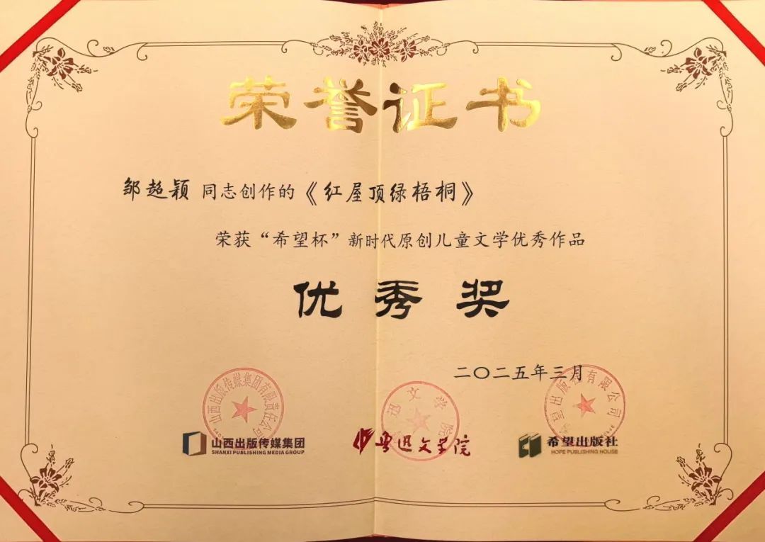 3月9日下午,“希望杯”新时代原创儿童文学优秀作品奖在北京颁布,我校人文与艺术学院副教授、驻校作家邹超颖创作的长篇小说《红屋顶绿梧桐》,从475篇作品中脱颖而出,荣获“优秀奖”。
