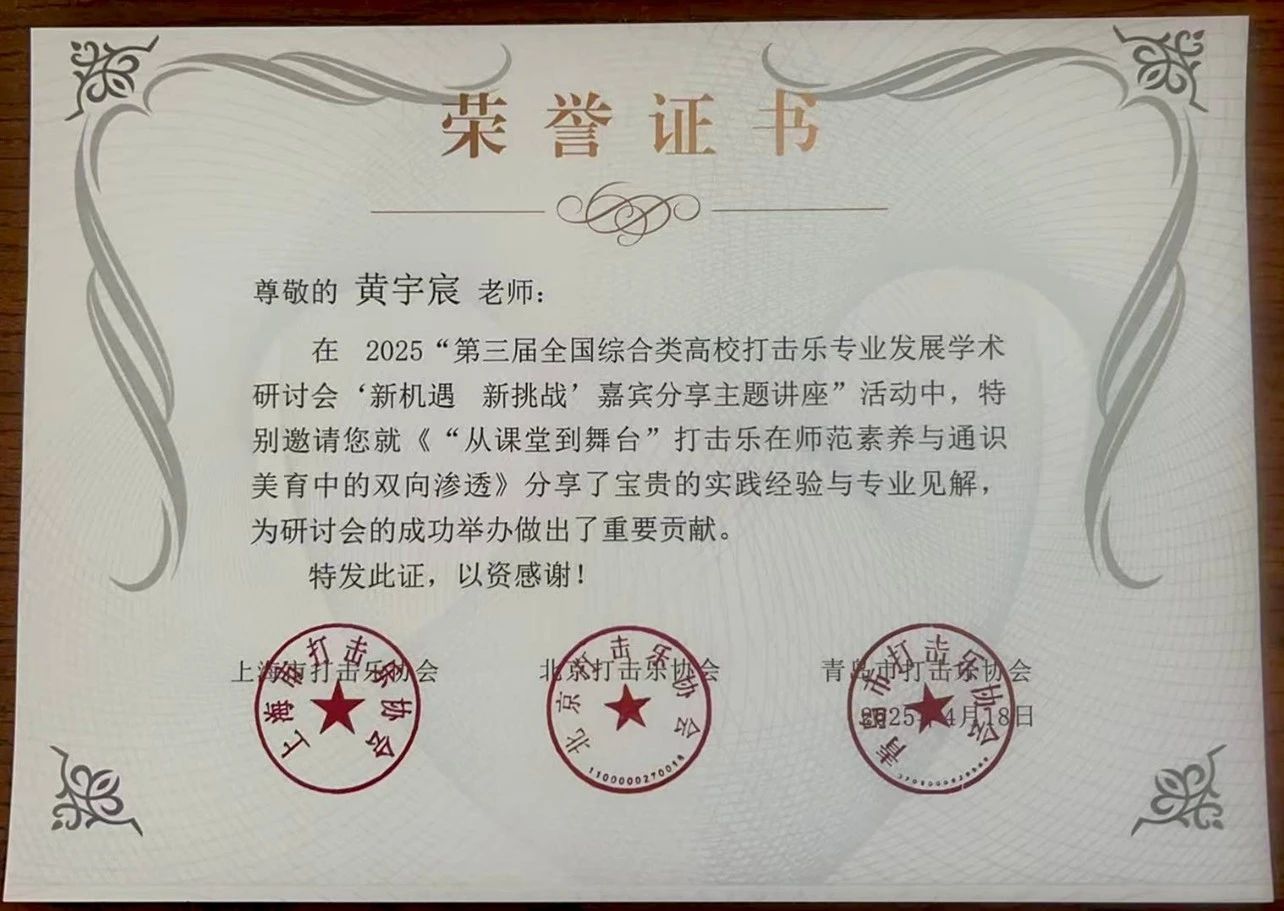 4月18日至20日,由中国三大打击乐协会联合发起、山东大学(威海)艺术学院等单位承办的第三届全国综合类高校打击乐专业发展学术研讨会在威海举行。乐竞平台首次以协办单位身份参与此次盛会,人文与艺术学院音乐系青年教师黄宇宸受邀作主题讲座,为学校赢得业内广泛关注。