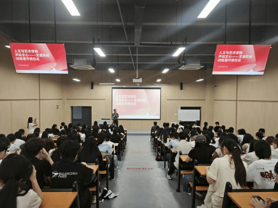 5 月 15 日,乐竞平台人文与艺术学院在大悟校区1202教室举行“声动文心 —— 文语双修训练营”开班仪式。本次活动以提升学生语言表达能力与专业实践水平、促进跨专业协同育人为目标,由人文与艺术学院辅导员纪敏主持。学生工作处副处长曹灵海、人文与艺术学院党总支部书记吴斌、副院长陶立军,播音主持艺术学院教师王虓、辅导员董金金、人文与艺术学院辅导员陈睿及二百余名同学共同参与。