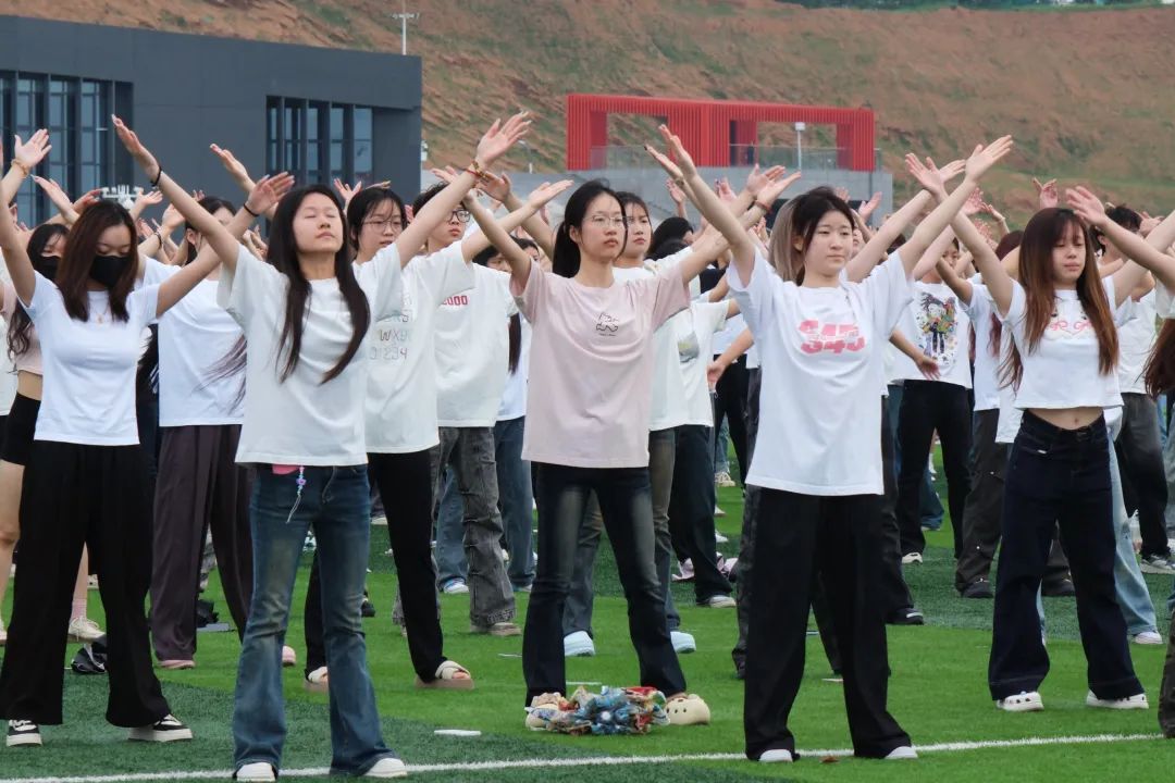 各学院参赛方阵依次登场,从入场时的队列整齐,到广播操动作的规范有力,无不展现出前期训练的扎实功底。伸展运动的舒展、踢腿运动的利落、跳跃运动的轻盈…… 千名学子在阳光下同步挥臂、转身、跳跃,动作行云流水。方阵间的比拼不仅是肢体协调性的较量,更是团队凝聚力的展现 —— 服装的统一配色、队列的精准走位、表情的自信从容,共同勾勒出校园里最富朝气的风景线。