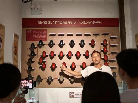 活动中,在非物质文化遗产“李氏漆器髹饰技艺”第六代传承人、“大隗铁艺”第四代传承人隗鹏老师的带领下参观襄阳漆器博物馆。在参观过程中隗鹏老师流露出对大漆的热爱和坚守,希望更多的年轻人能够关注到这项非遗,共同助力非物质文化遗产“大漆制作”的传承。此次暑期社会实践非遗大漆传承探访活动,让同学们近距离的感受到了非遗的魅力。让每个人都了解非遗文化的精湛技艺,为非遗文化的保护和发展贡献一份力量,推动中华文明的不断进步与发展。
