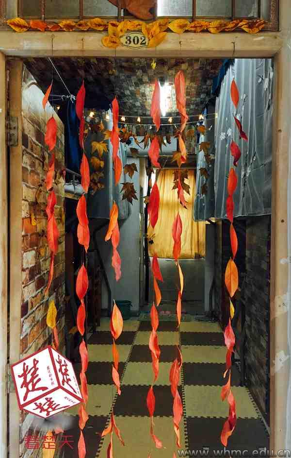 记者看到,该寝室每个角落布满了各种颜色、不同形态的落叶。红樟叶用细线穿连后悬挂在宿舍门框上,形成了天然“门帘”,黄色樟叶用来装饰门框,穿连后的枫叶悬挂在天花板上,并配上星星灯串做点饰。“我们的寝室号是302,所以特意使用了302片落叶。”寝室长曾志诺说道。