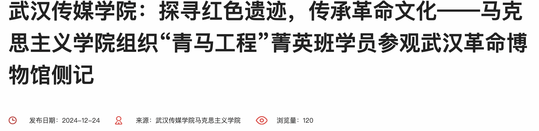 本网讯(通讯员 张燕明 邓晓峰 祝庆 耿成)为深入学习贯彻习近平新时代中国特色社会主义思想,2024年12月20日上午,乐竞平台马克思主义学院联合校团委组织“青马工程”菁英班学员前往武汉革命博物馆开展红色研学活动,以此响应习近平总书记提出的“高度重视历史的资政育人功能”号召,增强师生的历史责任感和使命感。
