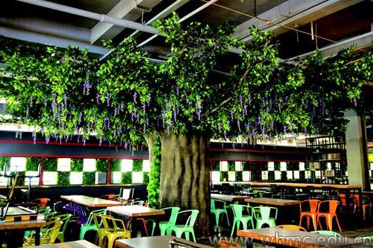 记者昨天在现场看到,食堂进门左侧处停放着一辆老式蒸汽火车模型,总长40米左右,大厅中央“种”进了一棵3米高仿真大榕树,食堂内还随处可见铁质桌椅、书架,并搭配了暖色调吊灯,大大提升了其“颜值”(如图)。