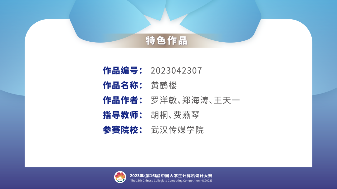 我院罗洋敏、郑海涛、王天一创作,胡桐、费燕琴老师指导的作品黄鹤楼,入围微课与教学辅助类全国特色作品(全国仅五组作品入围)。
